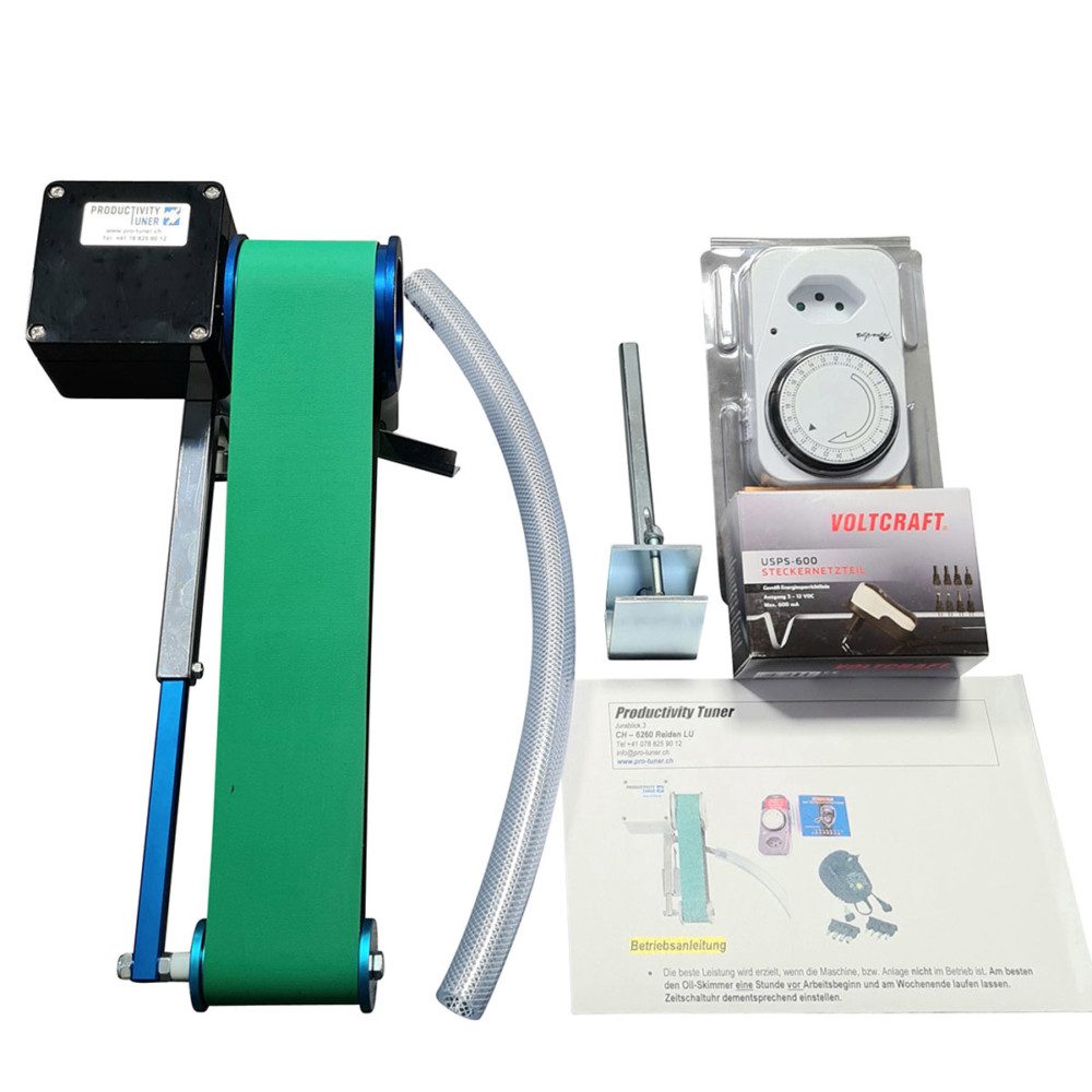 Deshalb entwickeln und fertigen wir seit 2006 eigene Lösungen mit technischen Innovationen: Zum Beispiel arbeitet unser Ölabscheider (Bandskimmer) mit einer Federvorspannung, die ein stärkeres Ölaufnahmeband mit gröberer Oberflächenstruktur ermöglicht. Zudem ist der Austragswinkel positiv (bis 30 Grad). Mit diesen Eigenschaften erzielt er bis zu drei Liter Schmutzaustrag pro Minute.